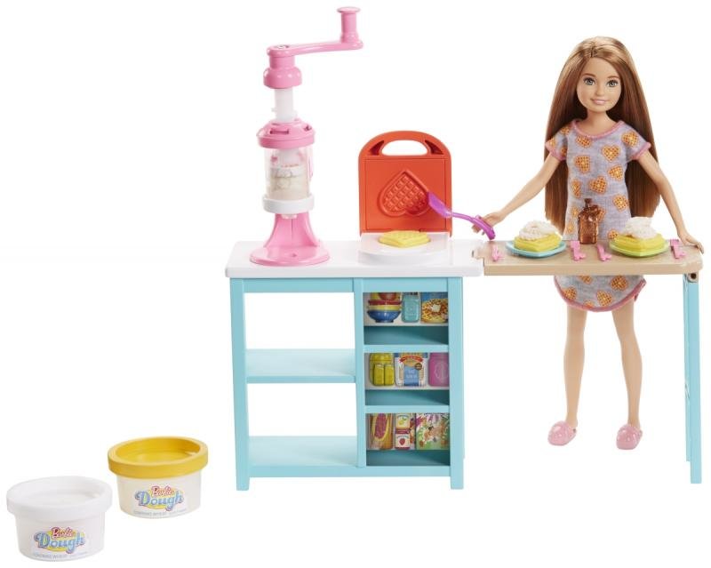 Snídaně je nejdůležitější jídlo dne a díky panence Stacie™ a jejímu snídaňovému setu už ji nikdy nezmeškáš. V setu na tebe čeká kuchyňský pult, servírovací nástroje, vaflovač a výrobník šlehačky. Oba přístroje navíc opravdu fungují! Pojďme připravit snídani snadno a rychle! Vlož béžové těsto do...