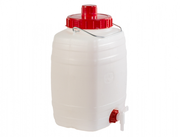 Plastikowy pojemnik z obrotowym zamknięciem i kranem spustowym przeznaczony do transportu i przechowywania cieczy. Posiada certyfikat do kontaktu z żywnością. Wysokość: 37 cm, szerokość: 20 cm. Pojemność: 10 l. przeczytaj całość