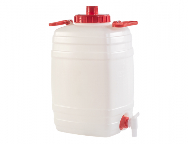 Plastowa beczka z obrotowym zamknięciem i kranem spustowym przeznaczona do transportu i przechowywania płynów. Posiada certyfikat dopuszczający kontakt z żywnością. Wysokość: 49 cm, szerokość: 26 cm. Pojemność: 25 l. przeczytaj całość