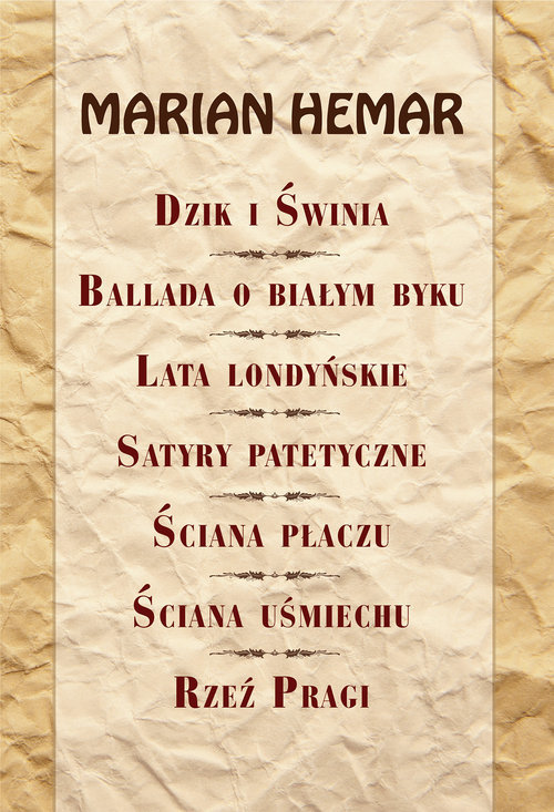 Na niniejszy tom składa się siedem wydanych pierwotnie osobno tomików poetyckich Mariana Hemara: 'Dzik i Świnia' (Lwów 1922), 'Ballada o białym byku' (Lwów, 1923), 'Lata londyńskie' (Londyn 1946), 'Satyry patetyczne' (Londyn 1947), 'Ściana płaczu' (Londyn 1968), 'Ściana uśmiechu' (Londyn 1968)...