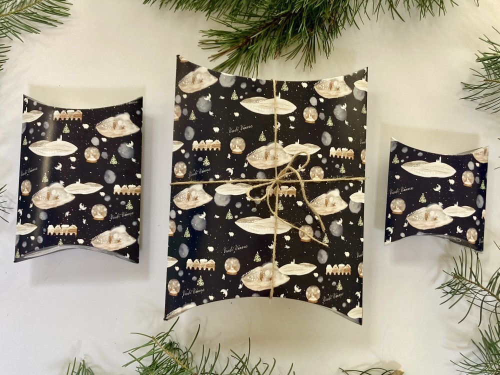 Obsahuje 3 ks krabiček ve velikostech: velká krabička 33x26x7 cmstřední krabička 21x16x4,5 cmmalá krabička 14x13,5x4 cmS originálním designemBarevný potisk na světlém papíře.Inspirovaný zimními radovánkami, krásou přírody a adventním obdobímŠetrně k příroděPapír je recyklovaný a...