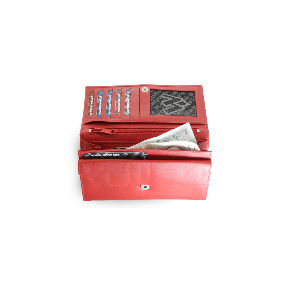 Kožená dámská peněženka od české značky Arwel, ve stylu psaníčkových peněženek.Vlastnosti:• široká přihrádka na bankovky• klopnová kapsa na mince• 6 kapes na kreditní karty• 3 velké vnitřní kapsy• 1 velká zipová kapsa• 1 zipová kapsa• 1 otevřená zadní kapsaMateriál: pravá hovězí kůže (nappa) przeczytaj całość