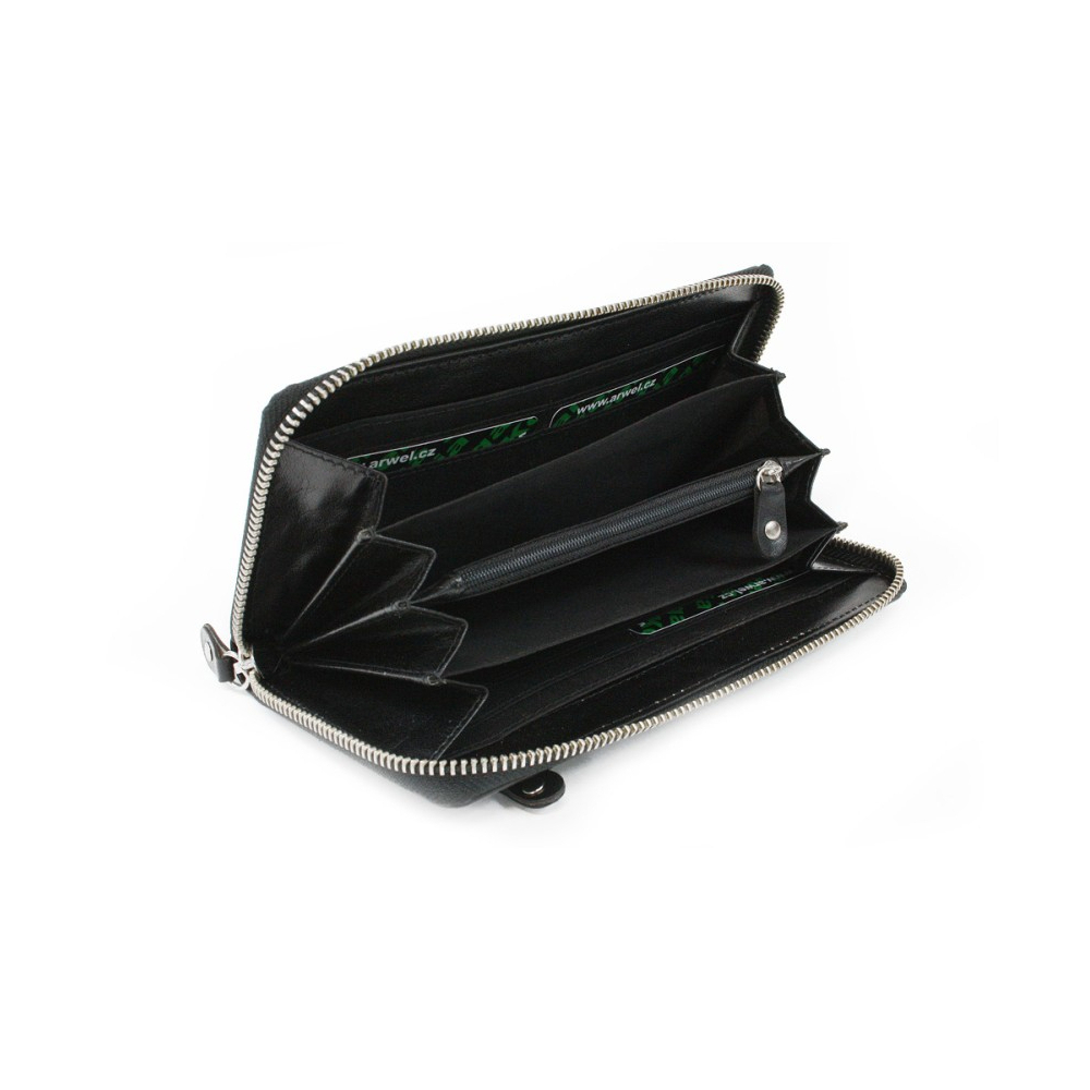 Kožená dámská peněženka od české značky Arwel, ve stylu psaníčkových peněženek.Vlastnosti:• na kovový zip• 2 přihrádky na bankovky• další 2 přihrádky, do kterých lze vložit mobilní telefon• vnitřní zipová kapsa na mince• 10 kapes na platební karty či doklady• 1 zipová kapsa na vnější zadní...