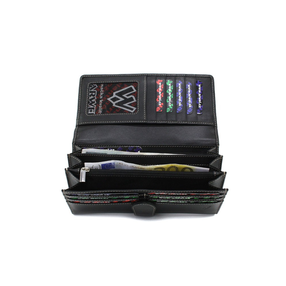 Kožená dámská peněženka od české značky Arwel, ve stylu psaníčkových peněženek.Vlastnosti:• se zápinkou• 2 přihrádky na bankovky• 1 zipová kapsa na mince• 17 kapes na kreditní karty• 1 průhledné kapsa• 2 vnitřní kapsy• 1 otevřená zadní kapsaMateriál: pravá hovězí kůže (nappa) + textil przeczytaj całość
