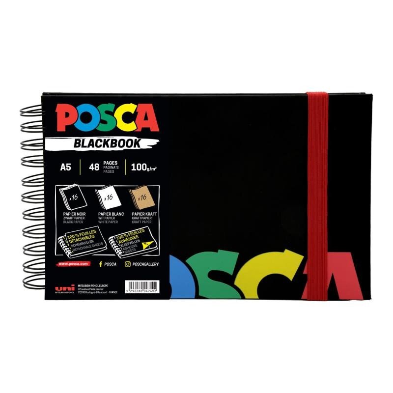 Szkicownik POSCA ma matowo czarne twarde okładki z kolorowym logo POSCA oraz czerwony pasek do zabezpieczenia. Można wybrać spośród 3 rodzajów papieru - szkicownik zawiera 16 czarnych, 16 białych i 16 stron w kolorze kartonu. Każda kartka jest samoprzylepna, wystarczy odkleić folię ochronną z tyłu. Szkicownik ma spiralne bindowanie, a kartki mają perforowane krawędzie. • formát: A5 • 48 stron - 16 czarnych, 16 białych i 16 stron w kolorze kartonu • gramatura: 100 g/m2 • perforowane krawędzie • samoprzylepne kartki • spiralne bindowanie • wyprodukowano: w Japonii