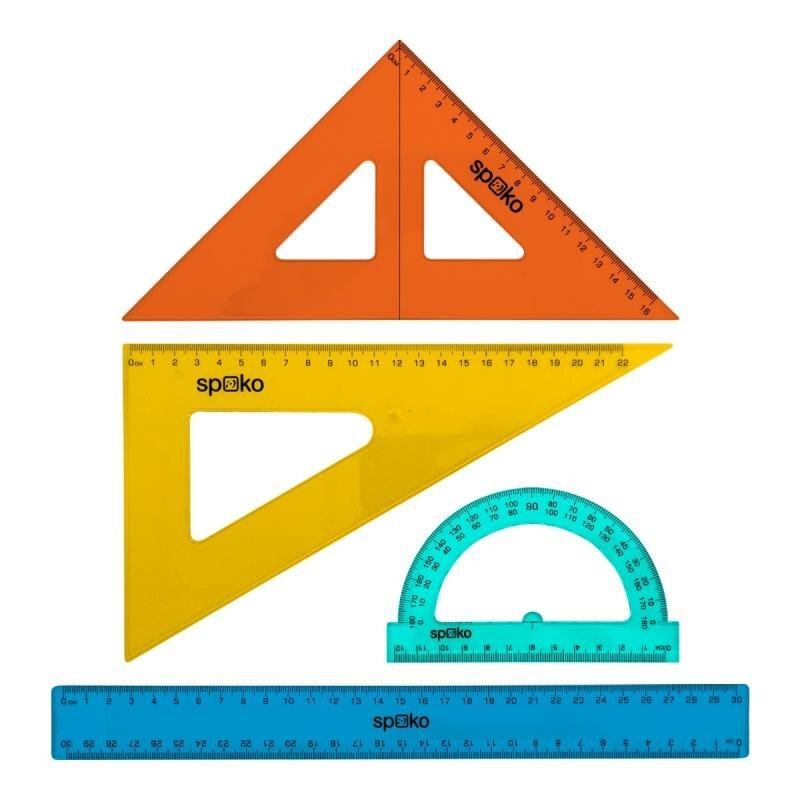 Czteroczęściowy zestaw linijek przeznaczony do geometrii szkolnej. Zestaw zawiera linijkę płaską, trójkąt z miarką, kątomierz, trójkąt prostokątny. • kątomierz: 12 cm; zakres kątów 180° • trójkąt z miarką: 16 cm; kąty 45°/90°/45° • trójkąt prostokątny: 22 cm; kąty 30°/60°/90° • linijka płaska: 30 cm • materiał: twardy i wytrzymały polistyren • mix kolorów: żółty, niebieski, pomarańczowy, turkusowy