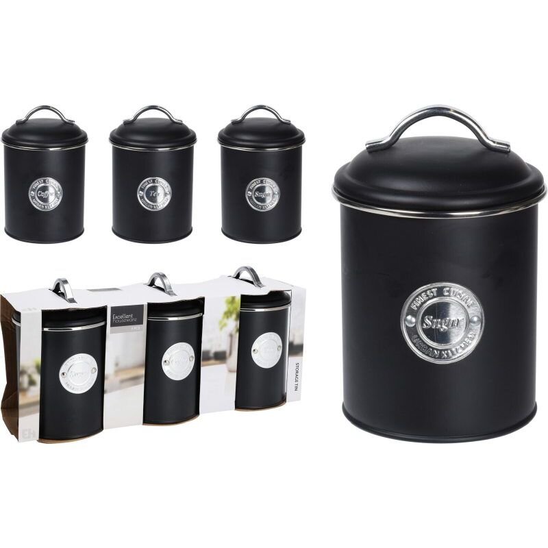 PUDEŁKO DO PRZECHOWYWANIA Z POKRYWKĄ, METALOWY ZESTAW 3 SZT., ROZMIAR ŚR 11XW16CM, WAGA 235 G KAŻDA. MATOWE CZARNE POKRYCIE Z ZASTOSOWANIEM CYNKU. 'KAWA', 'HERBATA', 'CUKIER'. KAŻDY ZESTAW W NASZEJ OPAKOWCE PROJEKTOWEJ. ŁĄCZNA WAGA 730 G / 355X115X170MM, Fala (SL20): 3 x Puszka do przechowywania, Metal/Aluminium, Czarny, 110X110X160MM / CFT 2,68,(8.001/40ft HQ)