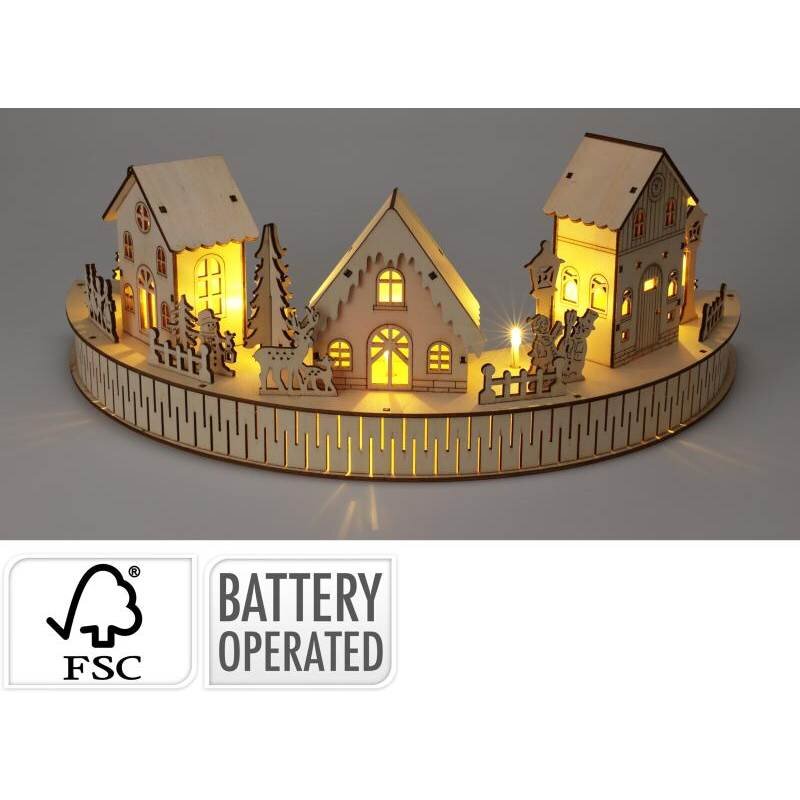 ILLUMINATED XMAS SCENE, POPLAR WOOD (POPULUS TREMULA), SIZE: 40X20X16,5CM, HALF ROUND SHAPE WITH 3 HOUSES AND 13 OTHER FIGURINES IN WHITE COLOUR, WITH 10X WARM WHITE LED, B/O, 2X AA BATTERIES NOT INCLUDED, PACKAGING CERTIFIED/ 410X215X175MM, Color box (CLB-C): WEEE / CFT 2,53,(3.760/40ft HQ)