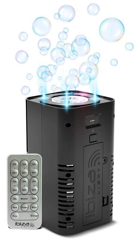 Szukasz wyjątkowej rozrywki jak żadna inna? Ta kompaktowa maszyna do baniek jest dla Ciebie idealna! Zadziwi Cię jej imponująca produkcja mydlanych baniek wirujących w powietrzu, podkreślonych 4 diodami LED, które wydobywają kolory baniek. Zasięg projekcji do 2,50 m w pomieszczeniach. Maszyna do baniek zasilana jest bateriami (4x 1,5V AA). W opakowaniu znajduje się pilot do wyboru programów świetlnych. Maszyna posiada przełączniki DIP do ustawień oraz możliwość niezależnego sterowania wieloma maszynami jednym pilotem (np. stopniowe włączanie). Zbiornik na płyn ma pojemność 100 ml.