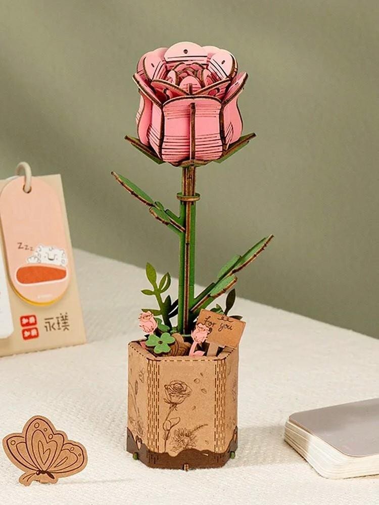 Dřevěné 3D puzzle. Poskládej si propracovaný model růžové růže s krásnými detaily a barvami za pomoci obrázkového návodu. V balení se nacházejí dřevěné desky s laserem předřezanými díly, které do sebe zapadají. Rozměry poskládaného modelu jsou 210x65x85 mm. Vhodné pro manuální zručné lidi 8+. przeczytaj całość