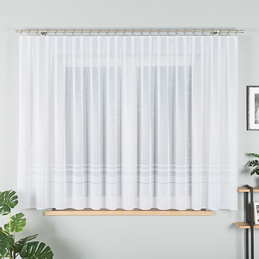 Wysokiej jakości krótka gotowa dekoracyjna firana w nowoczesnym, modnym wykonaniu do kuchni lub salonu o wymiarze 400x160 cm. Firana jest przygotowana do zawieszenia na żabki. 1 sztuka w opakowaniu.