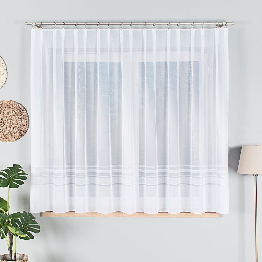 Wysokiej jakości krótka gotowa dekoracyjna firana w nowoczesnym, modnym wykonaniu do kuchni lub salonu o wymiarach 300x160 cm. Firana jest przygotowana do zawieszenia na żabki. 1 sztuka w opakowaniu.