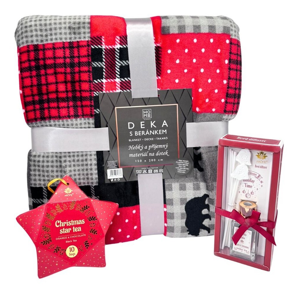HOME ELEMENTS Vánoční set beránková deka Tlapkové káro a čaj hvězda a difuzér