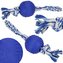 ZÁKLADNÍ INFORMACE Značka: Springos®. Barva: odstíny modré a bílé. Materiál: TPR, bavlna. Velikost: 25 cm. Rozměry: Celková délka: cca 25 cm. Průměr koule: 6,5 cm. Tloušťka lana: 0,9 cm. Dodatečné informace: Koule z termoplastické pryže má uvnitř volný prvek, který při zatřesení vydává dutý zvuk. przeczytaj całość