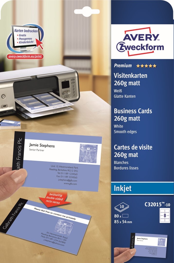 Avery Zweckform vizitky, s hladkým okrajem, 8ks/A4, oboustranné typ matné, bílé, A4, 260 g/m2, 85x54mm, 10 listů, pro inkoustové t