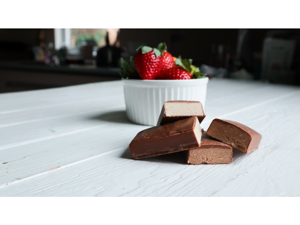 Skład: Mleczna czekolada (masło kakaowe, naturalne włókno z korzenia cykorii, suszone mleko pełne, miazga kakaowa, naturalne włókno kukurydziane, emulgator: lecytyna słonecznikowa, naturalny ekstrakt waniliowy), środek zagęszczający: polidekstroza, białko serwatkowe (15 %), białko sojowe (14,9 %), substancja nawilżająca: glicerol, masło shea, suszone mleko pełne, substytut cukru: erytrytol, aromat migdałowy 0,7 %, mieszanka witamin i minerałów: magnez (tlenek magnezu), witamina C (kwas L-askorbinowy), witamina B3 (niacynamid), żelazo (fumaran żelaza(II)), witamina E (octan D-alfa-tokoferylu), cynk (cytrynian cynku), witamina B5 (pantotenian wapnia), mangan (glukonian manganowy), witamina B2 (ryboflawina), witamina B6 (chlorowodorek pirydoksyny), witamina B1 (mononitrat tiaminy), miedź (glukonian miedziowy), witamina A (octan retinylu), witamina B9 (kwas foliowy), jod (jodek potasu), witamina K (filochinon), selen (azotan sodu selenu), biotyna (D-biotyna), chrom (chlorek chromowy), witamina D (cholekalcyferol), witamina B12 (hydroksykobalamina), substytut cukru: glikozydy stewiolowe ze stewii. Zawartość suchej masy kakaowej w czekoladzie co najmniej 44 %.