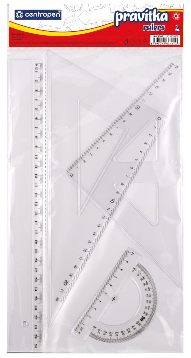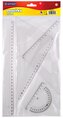 Ten praktyczny zestaw zawiera wszystko, co niezbędne do precyzyjnej pracy z liniami i kątami. W skład wchodzą dwa wysokiej jakości trójkąty - jeden z podziałką 45°/177 mm oraz drugi z podziałką 60°/250 mm, uniwersalny kątomierz 180°/100 mm z podziałką ułatwiającą odczyt kątów oraz linijka o długości 30 cm. Wszystko wykonane jest z przezroczystego plastiku, co ułatwia dokładne ustawienie i pracę nad szczegółowymi szkicami bez przeszkód.