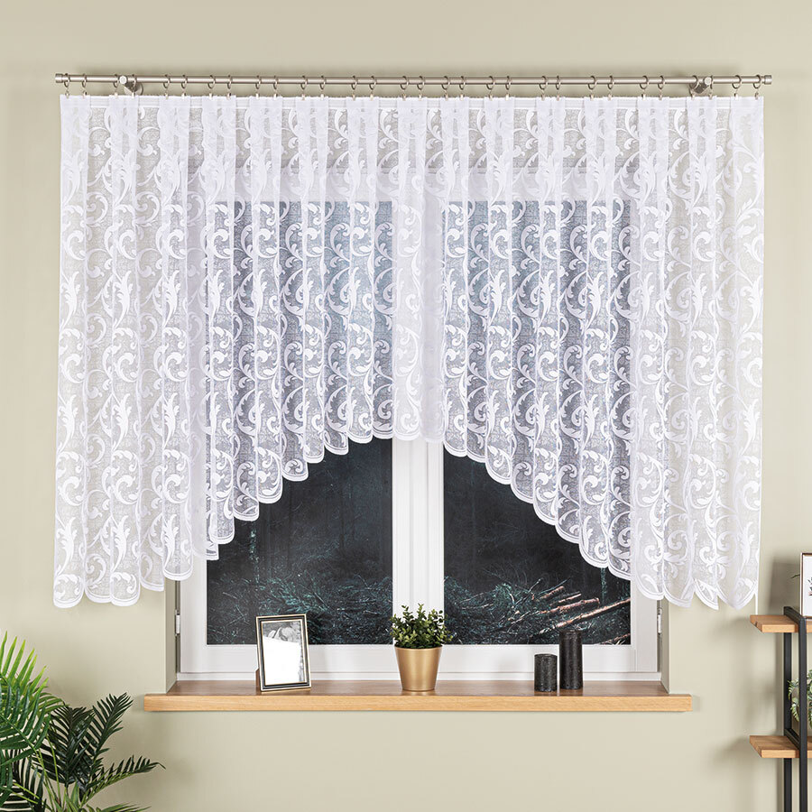 Kvalitní krátká oblouková hotová dekorační záclona v moderním trendovém provedení do kuchyně nebo obývacího pokoje. Záclona je připravena na zavěšení na žabky. 1 kus v balení.Rozměr : 1x 450x135 cm - šířka 450 cm, výška 135 cm - doporučujeme garnyž od 200 do 270 cm przeczytaj całość