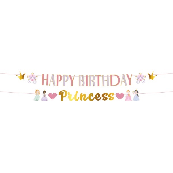 Sada dvou nápisů v tématu princeznovská párty. Sada obsahuje nápis Happy Birthday a Princess, které jsou bohatě zdobené a oba umístěné na samostatném provázku. Každý nápis má délku cca 75 cm a balení obsahuje dvě stuhy o délce cca 1 m. Takže můžete vytvořit dva nápisy, každý o celkové délce 1 m, nebo jeden o celkové délce cca 2 m.