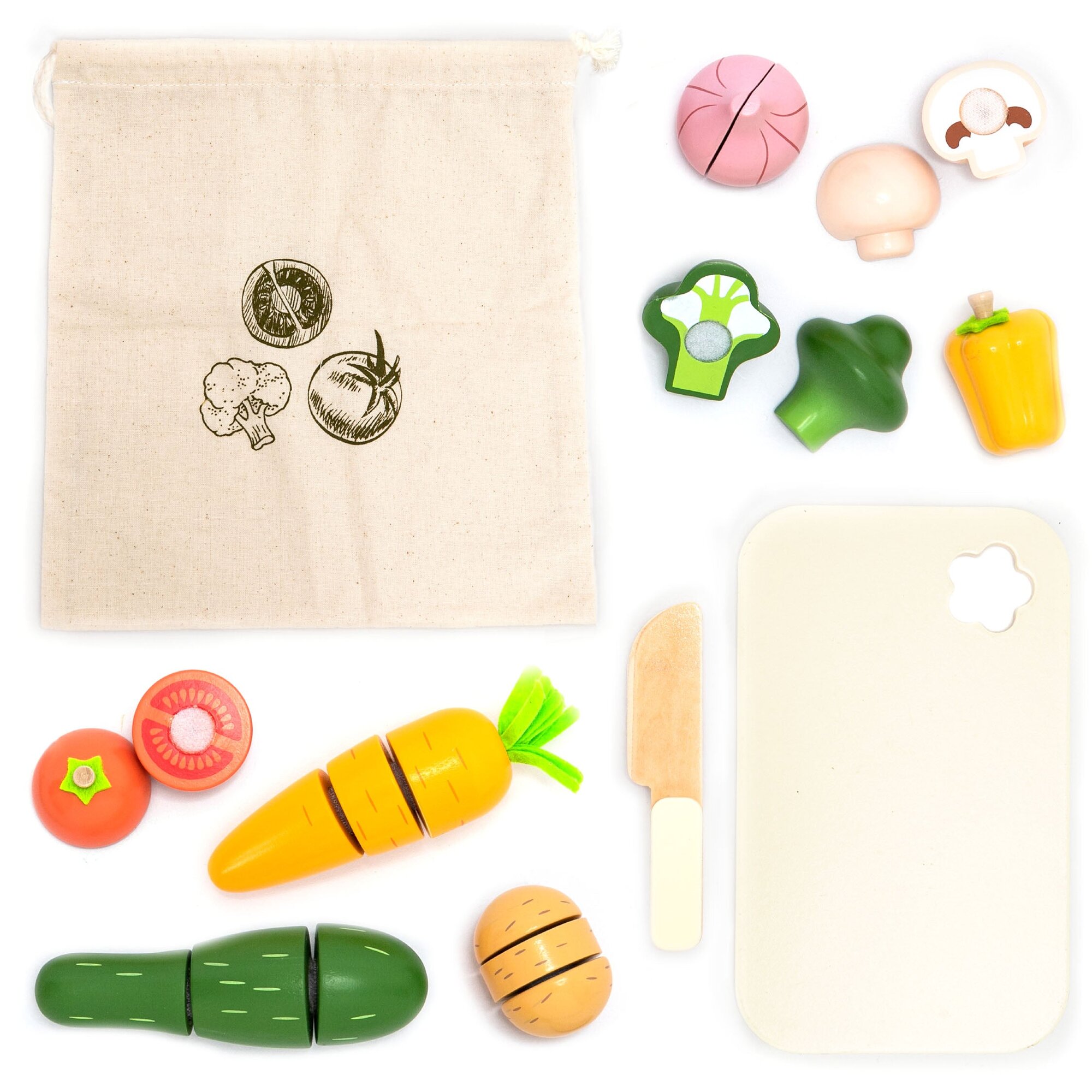 Dřevěná zelenina na krájení pro děti obsahuje 22 dílů potravin a doplňků do dětské kuchyňky - bezpečný dřevěný nůž, prkénko na krájení, vak na zeleninu atd., Skvěle doplňuje kuchyňské hračky (Sada na vaření) a dětská kuchyňka bude s touto sadou zase o něco reálnější - rozvíjí myšlení, jazykové a především motorické dovednosti (koordinace oko-ruka). Dřevěná hračka pro kluky i holky