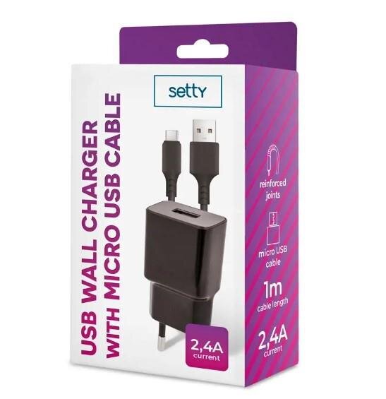 Nabíječka do sítě Setty 2,4A s kabelem USB/microUSB 1m, 1xUSB černá