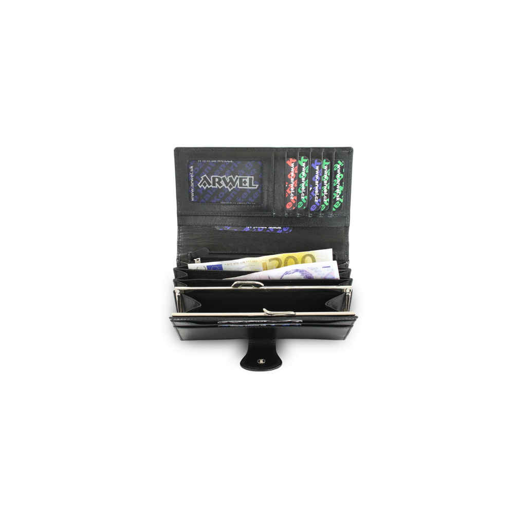 Kožená dámská peněženka od české značky Arwel, ve stylu psaníčkových peněženek.Vlastnosti:• s ozdobnou klopnou• 3 přihrádky na bankovky• rámová kapsa na mince• 10 kapes na kreditní karty, občanský průkaz nebo řidičský průkaz• vnitřní zipová kapsička• 2 velké vnitřní kapsy na dokumenty• venkovní zadní kapsa• dodávané ve stylové dárkové krabičceMateriál: pravá hovězí kůže (Buff DD)