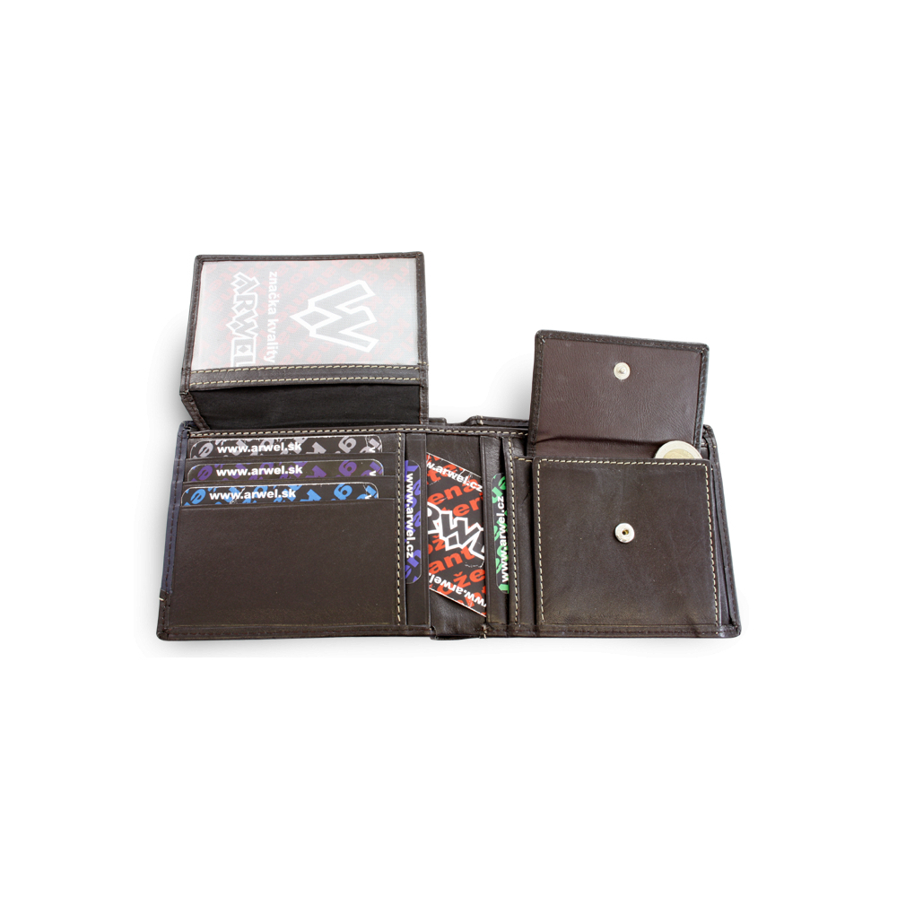 Kožená pánská peněženka od české značky Arwel.Vlastnosti:• 2 přihrádky na bankovky• 1 kapsa na mince• 12 kapes na kreditní karty• 1 průhledná kapsa velikosti osobních dokladůMateriál: pravá hovězí kůže (nappa) przeczytaj całość