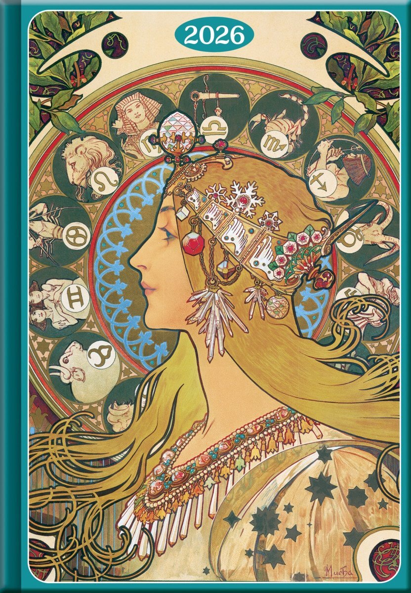 Týdenní diář s obálkou inspirovanou stylem Alfonse Muchy zaujme na první pohled svým uměleckým designem a kvalitní zlatou ražbou. Vnitřní kalendárium přehledně rozložené na dvoustraně poskytuje dostatek prostoru pro poznámky, plánování událostí i každodenních povinností. Ideální pro ty, kteří hledají spojení elegance, praktičnosti a uměleckého ducha.