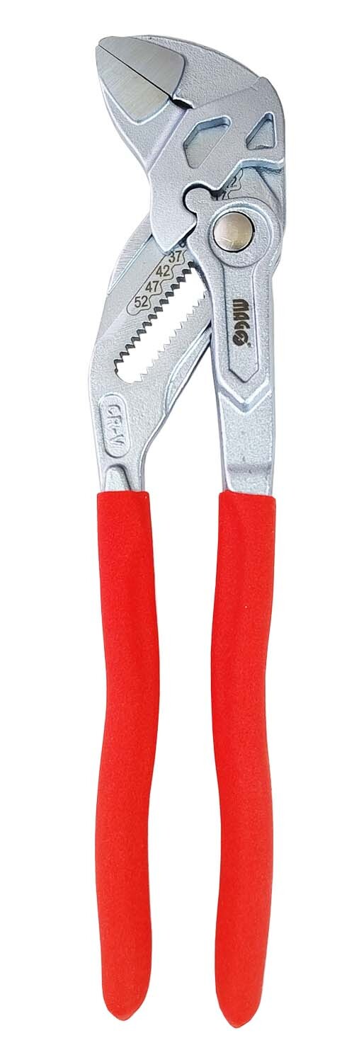 Szczypce SIKO MAGG wyposażone są w innowacyjny mechanizm szybkiego ustawiania, który umożliwia łatwe i szybkie dopasowanie rozmiaru szczęk bez konieczności używania dużej siły. Dzięki gumowanym, ergonomicznie ukształtowanym rękojeściom narzędzie jest wygodne i bezpieczne w użyciu nawet podczas dłuższej pracy. Konstrukcja z chromowo-wanadowej stali (CRV) gwarantuje wysoką wytrzymałość i długą żywotność, co docenią nie tylko hydraulicy i konserwatorzy, ale także profesjonaliści w przemyśle. Zaletą są także proste, gładkie szczęki bez rowków, które pozwalają mocno chwycić rury, nakrętki i profile bez uszkadzania powierzchni.