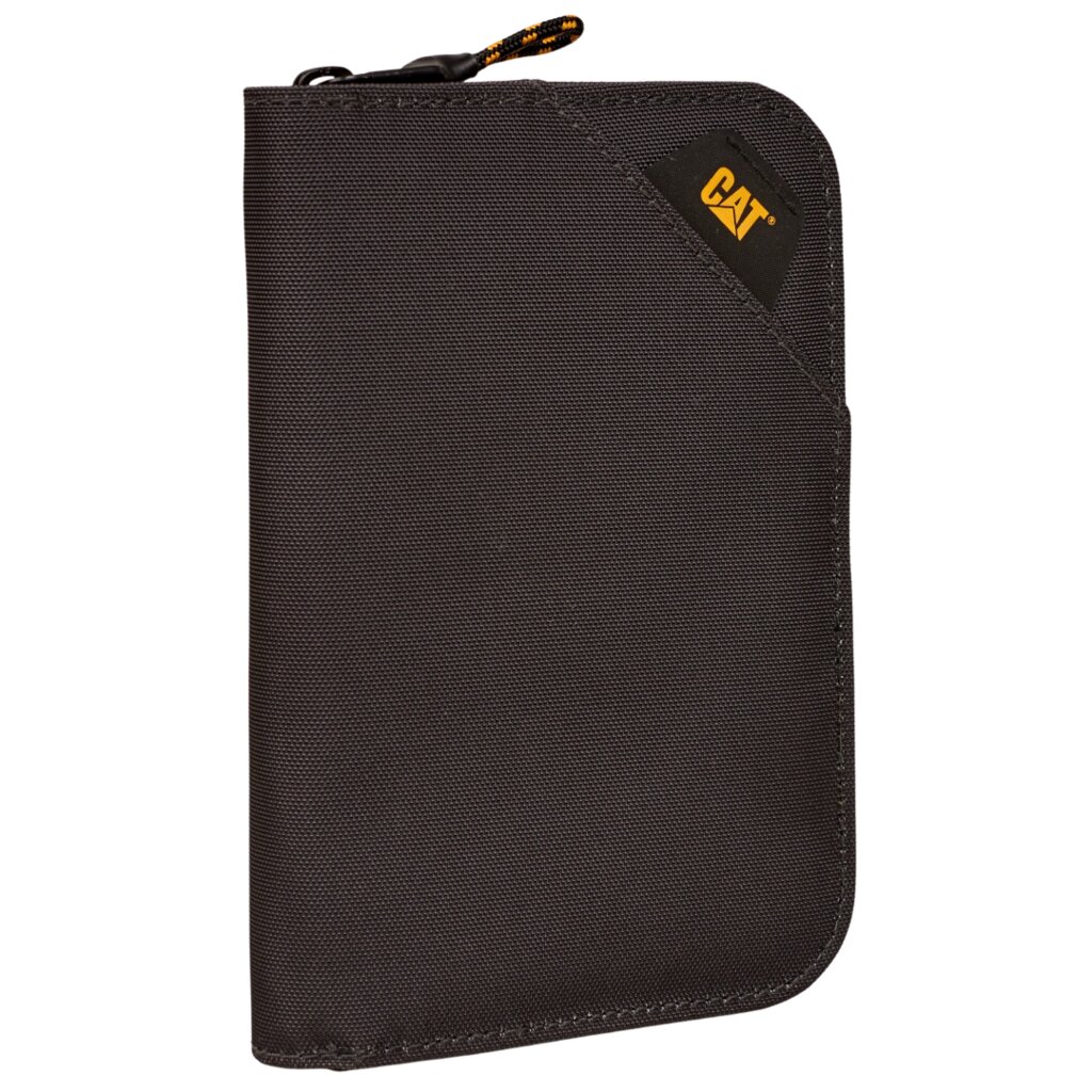 Praktyczny podróżny portfel CAT City Bizz Travel przechowa Twoje dokumenty, karty płatnicze i inne niezbędne drobiazgi bezpiecznie w jednym miejscu. Dzięki ochronie RFID zapobiegnie niechcianemu zeskanowaniu kart lub paszportów. Wewnątrz miejsce na dwa paszporty i cztery karty płatnicze, nie brakuje elastycznego uchwytu na długopis oraz siatkowanej kieszeni na zamek na drobiazgi. Tylna otwarta kieszeń pomieści na przykład kartę pokładową, dzięki czemu zawsze będziesz mieć ją pod ręką. Portfel wykonano z wytrzymałego, recyklingowanego poliestru i zdobi go naszywka z hypalonu z logo CAT.