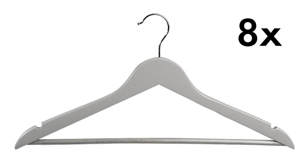Šatní ramínka 8 ks, lotosové dřevo, šedá KESPER Sada 8 ks šedých šatních ramínek z kvalitního lotosového dřeva s FSC® certifikací nabízí praktické i elegantní řešení pro organizaci oblečení. Díky protiskluzové úpravě, dvěma zářezům na sukně a liště na kalhoty jsou ramínka univerzální pro různé...