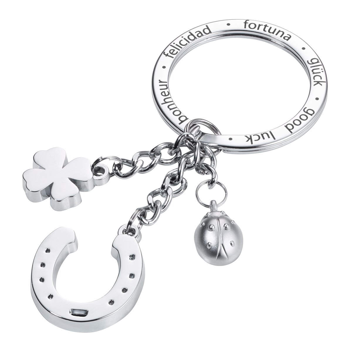 Klíčenka se 3 přívěsky - podkova, čtyřlístek a beruška. XL kroužek s rytinou „good luck“ v různých jazycích. Stříbrné provedení. przeczytaj całość