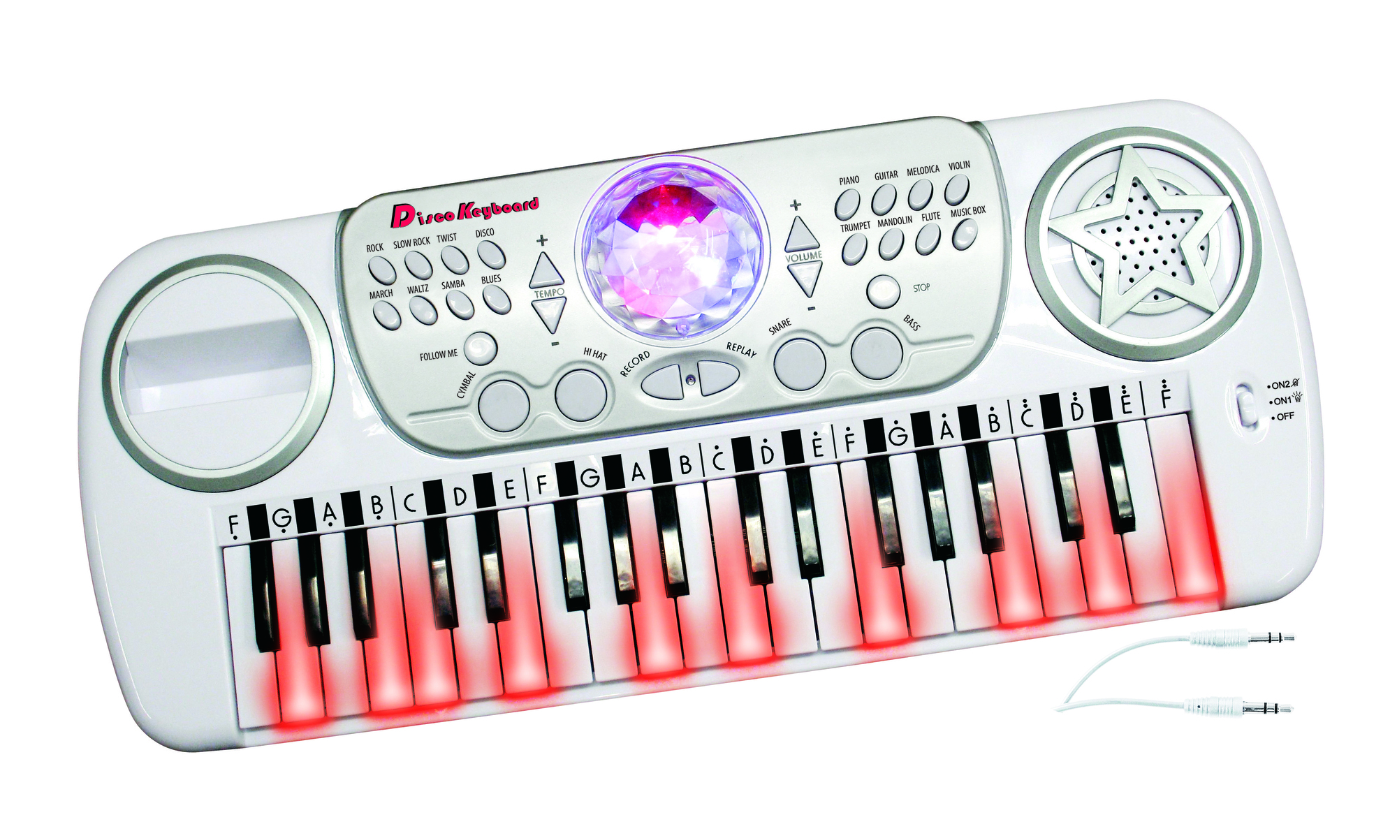 Klávesy s disco koulí a mikrofonem. Rozměry 50x21 cm. Disco koule se světelnými efekty. 37 kláves (bílé, černé). Funkce - výuka (hrajte podle světýlek a naučte se hrát), 22 ukázkových skladeb, 8 nástrojů, 8 rytmů, nastavení rychlosti tempa, 4 bicí, nahrávání a následné přehrávání, nastavení...