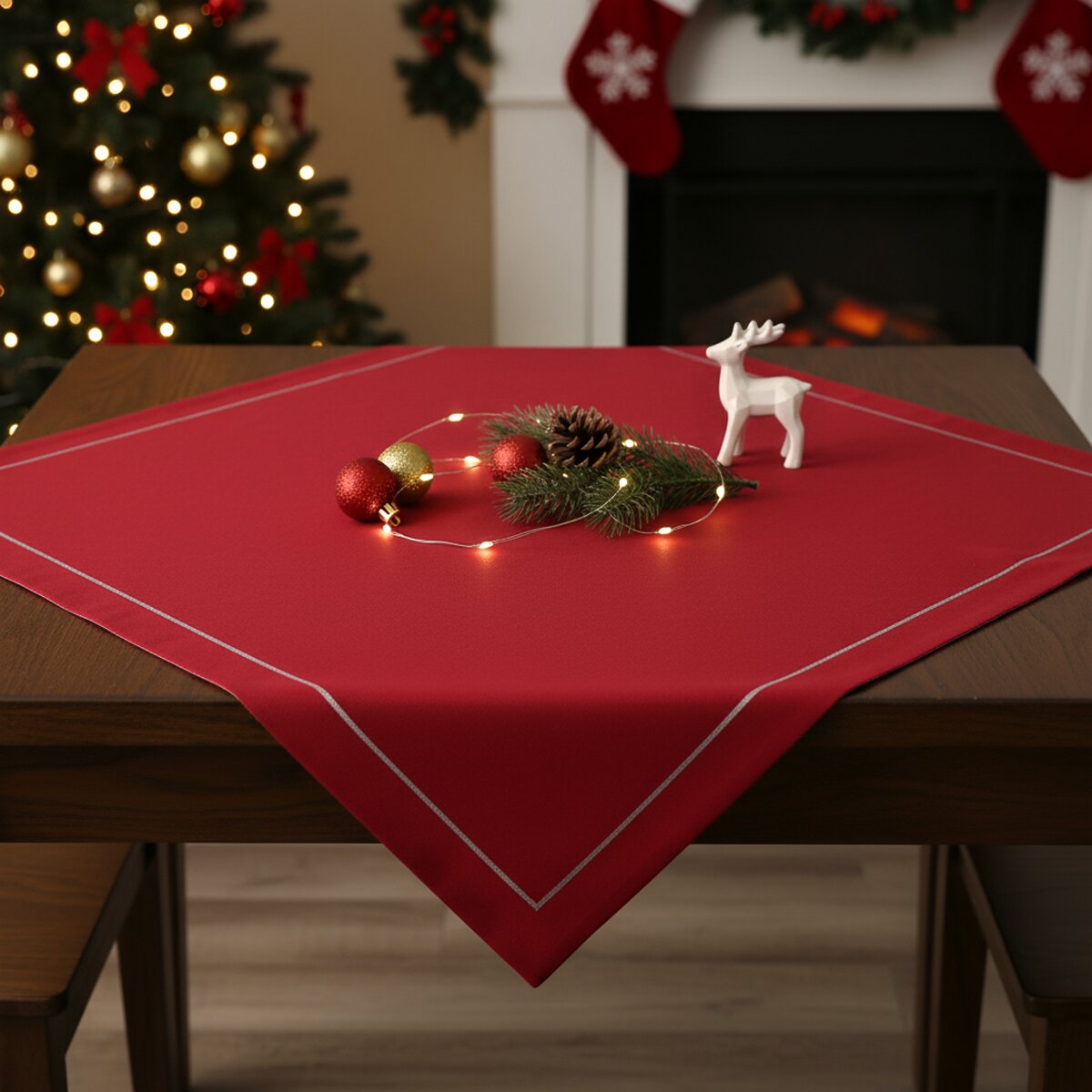 Dodejte svému jídelnímu stolu nový vzhled s elegantním ubrusem na stůl, který spojuje praktickou funkci a moderní design. Ubrus chrání stůl před poškrábáním, znečištěním i horkými nádobami, zároveň je však krásným doplňkem interiéru. Zlaté lemování v kombinaci s látkou v barvě lurexové vánoční červené dodává interiéru luxusní, přátelskou vánoční atmosféru.