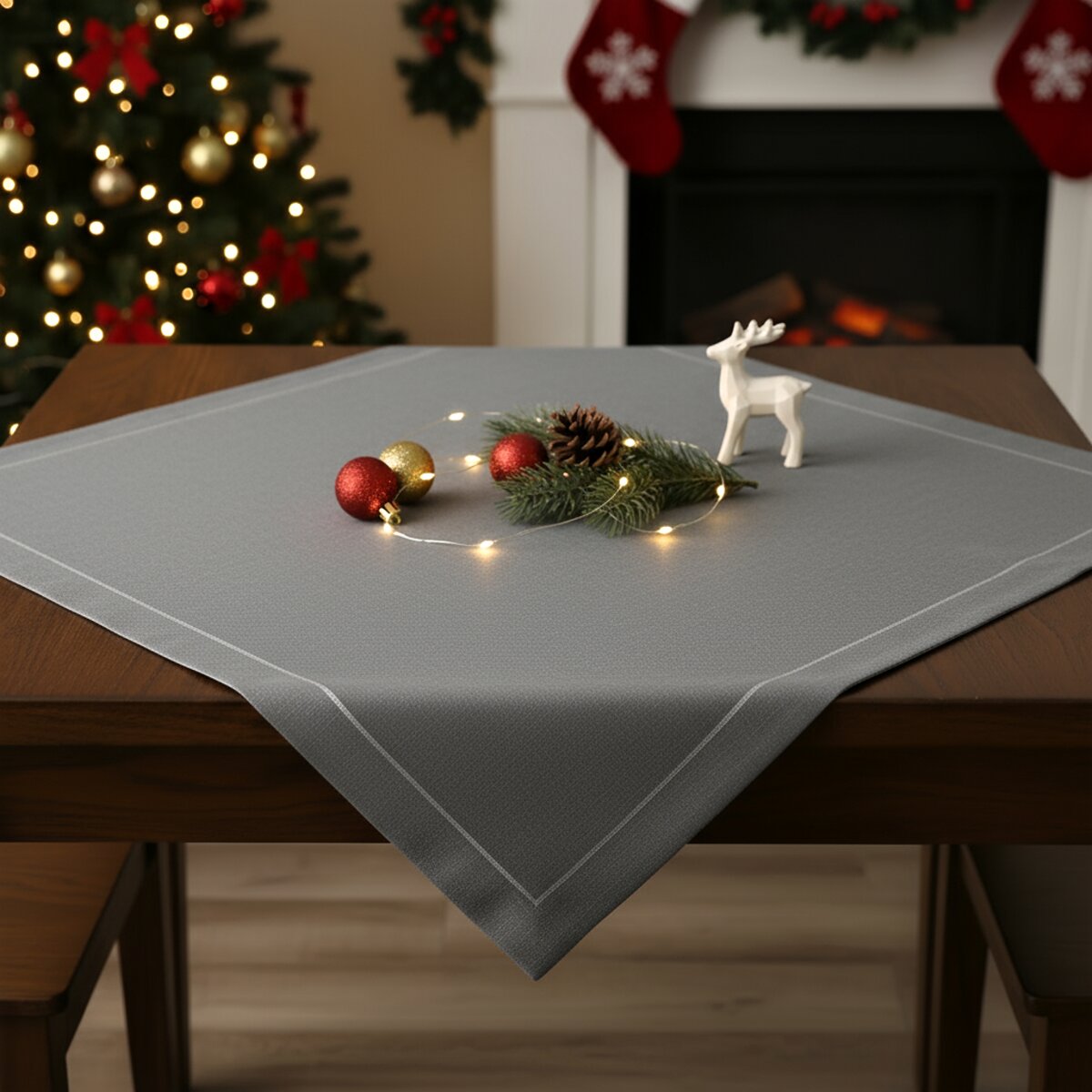 Dodejte svému jídelnímu stolu nový vzhled s elegantním ubrusem na stůl, který spojuje praktickou funkci a moderní design. Ubrus chrání stůl před poškrábáním, znečištěním i horkými nádobami, zároveň je však krásným doplňkem interiéru. Stříbrné lemování v kombinaci s látkou v barvě lurexové vánoční šedé dodává interiéru luxusní, přátelskou vánoční atmosféru.