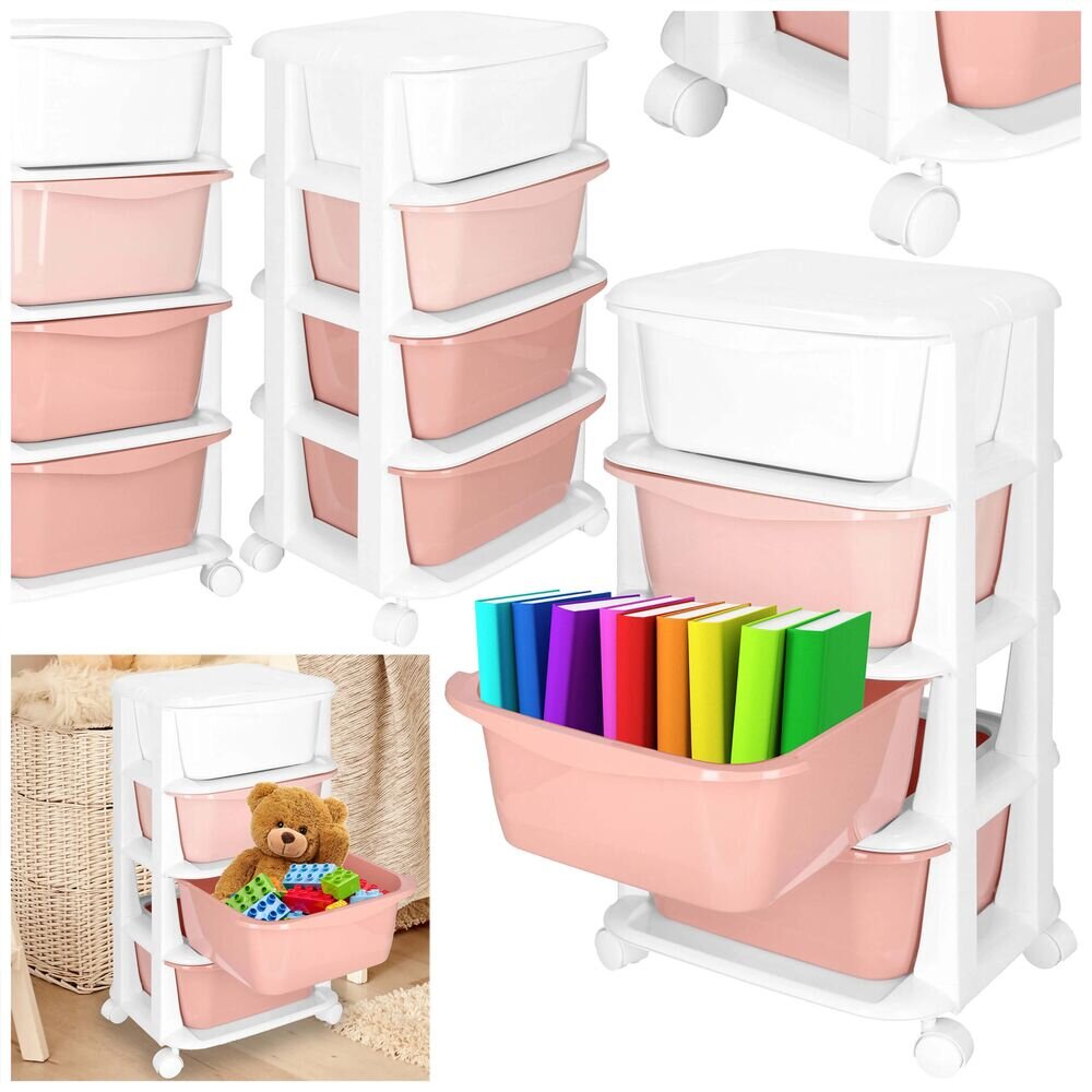 Základní údaje Značka: Springos® Materiál: plast Barva rámu: bílá Barvy zásuvek: červená, bílá, růžová (pastelová) Barva kol: bílá Maximální nosnost: 20 kg (5 kg na zásuvku) Počet zásuvek: 4 Rozměry: Celková výška: 73 cm Šířka: 36 cm Hloubka: 35 cm Tloušťka okraje: 4,5 cm Průměr koleček: 4 cm... przeczytaj całość