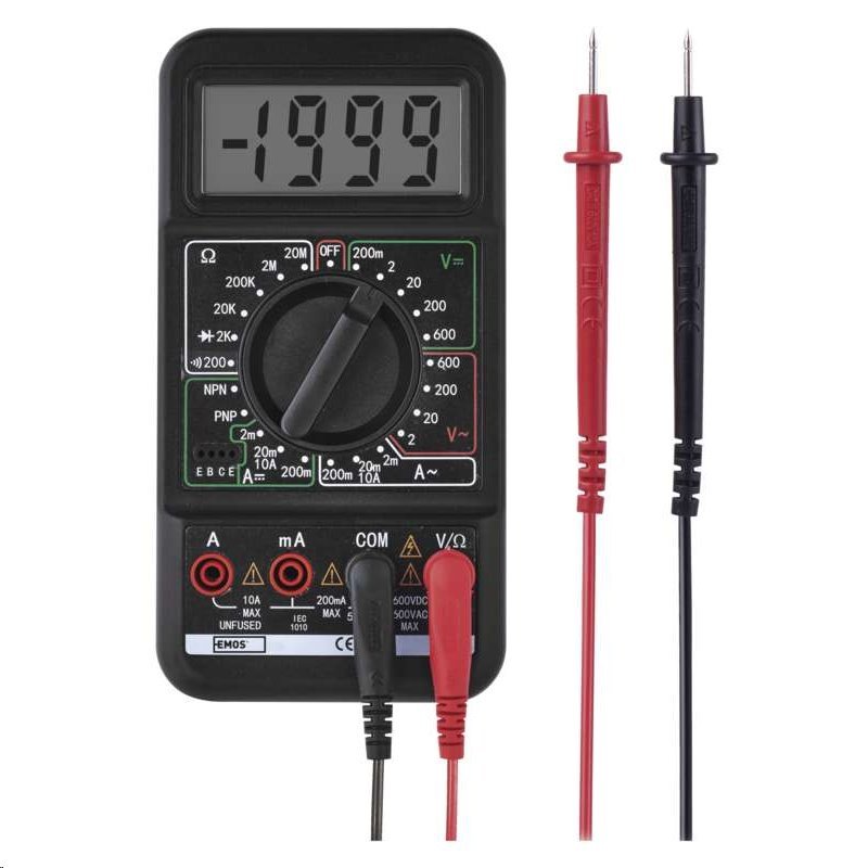 Napięcie AC: 2-600 V|Prąd AC: 2 mA - 10 A|automatyczne wyłączenie: nie|bezkontaktowe wykrywanie napięcia AC: nie|Napięcie DC: 200 mV - 600 V|Prąd DC: 2 mA - 10 A|opór elektryczny: 200 Ω - 20 MΩ|wskaźnik słabej baterii: tak|cęgowy multimetr: nie|kontaktowe wykrywanie napięcia AC: nie|pomiar temperatury: nie|zasilanie: 1× 9 V (w zestawie)|podświetlenie wyświetlacza: nie|opakowanie sprzedażowe: 1 szt., blister|wymiary: 32 × 85 × 165 mm|zawartość opakowania: bateria, instrukcja, przewody pomiarowe|ciągłość obwodów: tak|test baterii: nie|test diod: tak|test tranzystorów: tak|wybór zakresu: ręczny|zapis maks. wartości: nie|zapis zmierzonych wartości: nie|wyświetlanie na wyświetlaczu: 3,5 cyfry