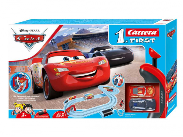 Tor Carrera FIRST został zaprojektowany specjalnie dla dzieci od 3 lat, oferując łatwą i bezpieczną zabawę. Przy długości trasy 2,9 metra oraz z autami Zygzak McQueen i Jackson Storm każdy mały zawodnik znajdzie coś dla siebie. Tor zawiera różne elementy, takie jak proste odcinki, zakręty oraz zwężenie trasy, które umożliwiają kolizje i zwiększają emocje podczas ścigania. Obracająca się brama dodaje grze dynamiki, a dzięki dwóm kontrolerom mogą ścigać się jednocześnie dwoje dzieci.