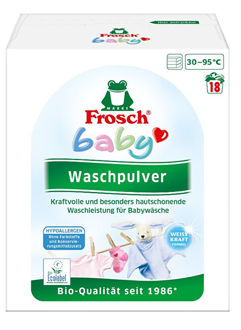Frosch EKO Baby prací prášek na kojenecké prádlo je hypoalergenní s vysokou prací sílou a jemným složením. Je určen pro dětské textilie, včetně bílého prádla.  przeczytaj całość