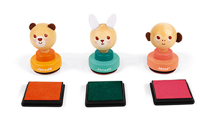 Janod DISPLEJ Dřevěná razítka s poduškou 3 motivy 24 ks