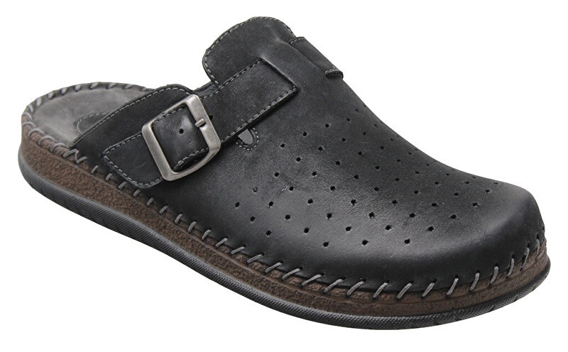 Pánský pohodlný pantofel s plnou špicí.Výrazně měkčená, pohodlná stélka.Svrchní materiál - perforovaná useň.Regulace šíře - přezka.Barva - černá. przeczytaj całość