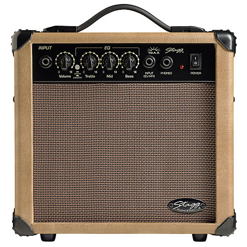 Kombo pro akustické kytary značky Stagg se zesilovačem 10 W RMS a 6,5" reproduktorem. Kombo je vybaveno vstupem 6,3 mm jack s přepínáním aktivního nebo pasivního snímání, ovládáním hlasitosti, třípásmovým ekvalizérem, vstupem 6,3 mm jack pro CD/MP3 a výstupem 6,3 mm jack na sluchátka.Povrchová úprava: béžový vinyl.Rozměry: 27 x 28 x 17 cm.Vidlice: UK.