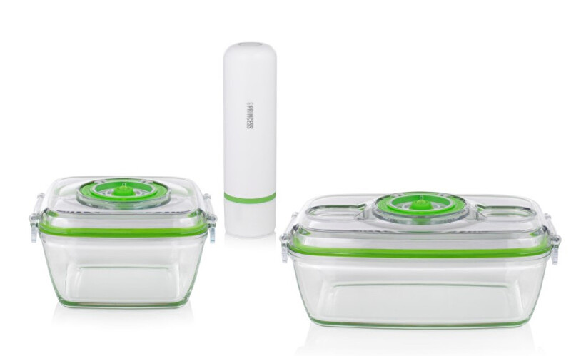 Ruční vakuovací set Princess 492985 je vybaven elektrickou vakuovací pumpou s příkonem 2,5 W a skleněnými nádobami o objemu 0,7 l a 1,1 l. Praktické skleněné nádoby jsou vhodné do klasické i mikrovlnné trouby a mají plastová víka vhodná do myčky nádobí i mrazáku. BPA free víka nabízejí svým uživatelům datumová kolečka pro maximální přehled.