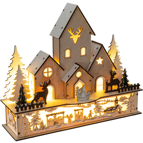 Ta dekoracja ze sklejki wysokiej jakości jest precyzyjnie wykonana i oferuje szczegółowe odwzorowanie świątecznej wioski, która będzie doskonałym dodatkiem do każdego wnętrza. Dzięki 9 ciepłym białym diodom LED tworzy przyjemną, wyjątkową atmosferę, która wprowadzi Ciebie i Twoich gości w świąteczny nastrój. Zasilanie zapewniają dwie baterie AA, co oznacza, że dekorację można łatwo umieścić w dowolnym miejscu bez konieczności podłączenia do sieci elektrycznej.