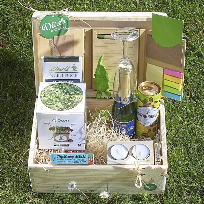 Domácí pohodu vám pomůže navodit vše co ukrývá krásný dřevěný box s víkem. Můžete si vypěstovat vlastní microgreens, které vám pohlídá ikonický trpaslík, zapsat si své úspěchy do recyklovaného bloku se sklenkou sektu nebo Mazagrande.