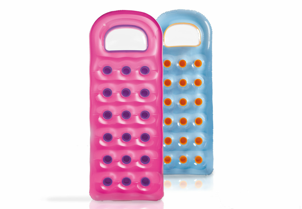 Materac wodny z okienkiem, 18-komorowy o wymiarach 188×71 cm. Dwie komory powietrzne, górna warstwa przezroczysta, a dolna z kolorowymi kieszeniami. Dwa warianty kolorystyczne. Profilowana poduszka dla dodatkowego komfortu. Zestaw naprawczy w komplecie. Wykonany z wysokiej jakości winylu. przeczytaj całość