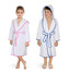 Župan je vyrobený z velice kvalitního froté materiálu ze 100% bavlny. Je dobře savý, hřejivý a vhodný i pro citlivou pokožku. Župan je zavinovací a stahuje se v pase pomocí pásku. Má kapucu , nemá kapsy,je opatřen poutkem na zavěšení. Délka županu 68 cm , délka rukávu 35 cm , obvod přes prsa 80 cm