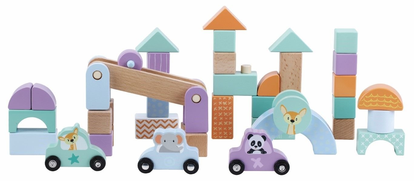 Dřevěné kostky 60 ks v balení s auty E01.064.1.1