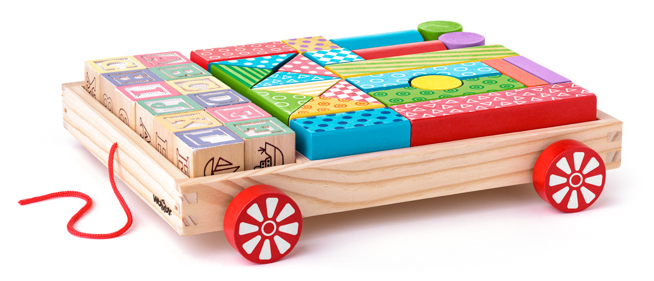 36ti dřevěných kostiček umístěných v dřevěném vozíku. 12 z nich je ze dvou stran barevná a je plasticky provedena tak, aby mohla sloužit po namočení do tiskařského polštářku i jako razítko. Ostatní kostky jsou v barevném provedení s potiskem. | Věk: 3+ | Rozměr: 27 x 24 x 6 cm przeczytaj całość
