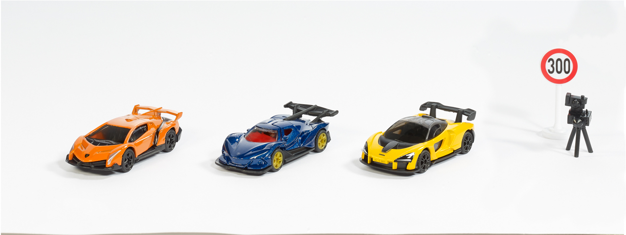 Każdy z tych trzech supersportowych samochodów sprawi, że serca ich fanów zabiją szybciej! Lamborghini Veneno, Apollo I.E. i McLaren Senna mają około 800 koni i potrafią przyspieszyć od 0 do 100 km/h w mniej niż 3 sekundy. Ale nie tylko ich osiągi zapierają dech w piersiach. Ich design również wyznacza standardy dla samochodów sportowych. Wyraziste linie, duże spoilery, szerokie progi i drzwi skrzydłowe zachęcają do jazdy po torze wyścigowym. Podobnie jak w oryginałach, wszystkie trzy modele mają charakterystyczny spoiler, a w Apollo I.E. drzwi skrzydłowe rzeczywiście się otwierają. Sportowe felgi z gumowanymi oponami są oczywiście częścią serii SIKU. Wszystkie trzy pojazdy należą obecnie do najszybszych, najwydajniejszych, najdroższych i najbardziej niezwykłych samochodów na świecie. Dla małych szeryfów w zestawie znajduje się znak drogowy „300 km/h” oraz radar do pomiaru prędkości. Wymiary opakowania: 29,6 x 11 x 4,8 cm. Wiek: 3+